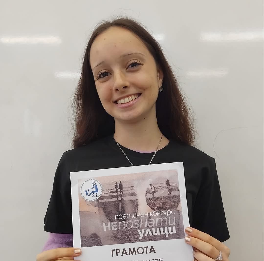 Дария Георгиева – ученичка в ХI клас в ПГТ „Алеко Константинов“ – Плевен, е отличена с приз за цялостно участие.
