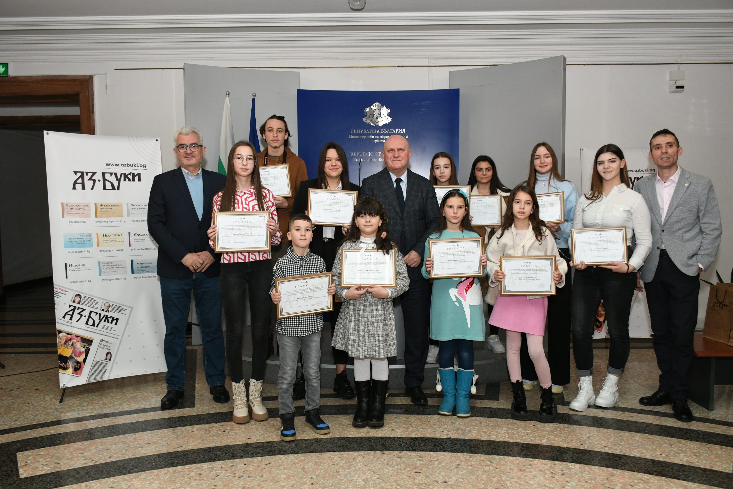 Министърът на образованието и науката проф. Галин Цоков награди на официална церемония в МОН 13-те победители в осмото издание на Националния фотоконкурс „Моето училище е най-хубавото“ на Национално издателство за образование и наука „Аз-буки“. Снимките на победителите са подредени в изложба и ще красят фоайето на МОН до края на месеца. Всички те са включени и в поредното специално издание на календара на НИОН „Аз-буки“ – „Моето училище е най-хубавото“.