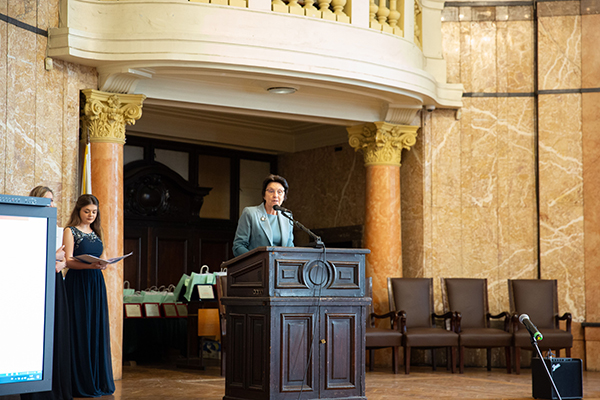 Зам.-министърът на образоването и науката Емилия Лазарова приветства председателя на Секцията Величка Николова и училищата за създадените таланти в областта на изкуството през изминалите години, които внасят красота в живота ни и прославят страната.