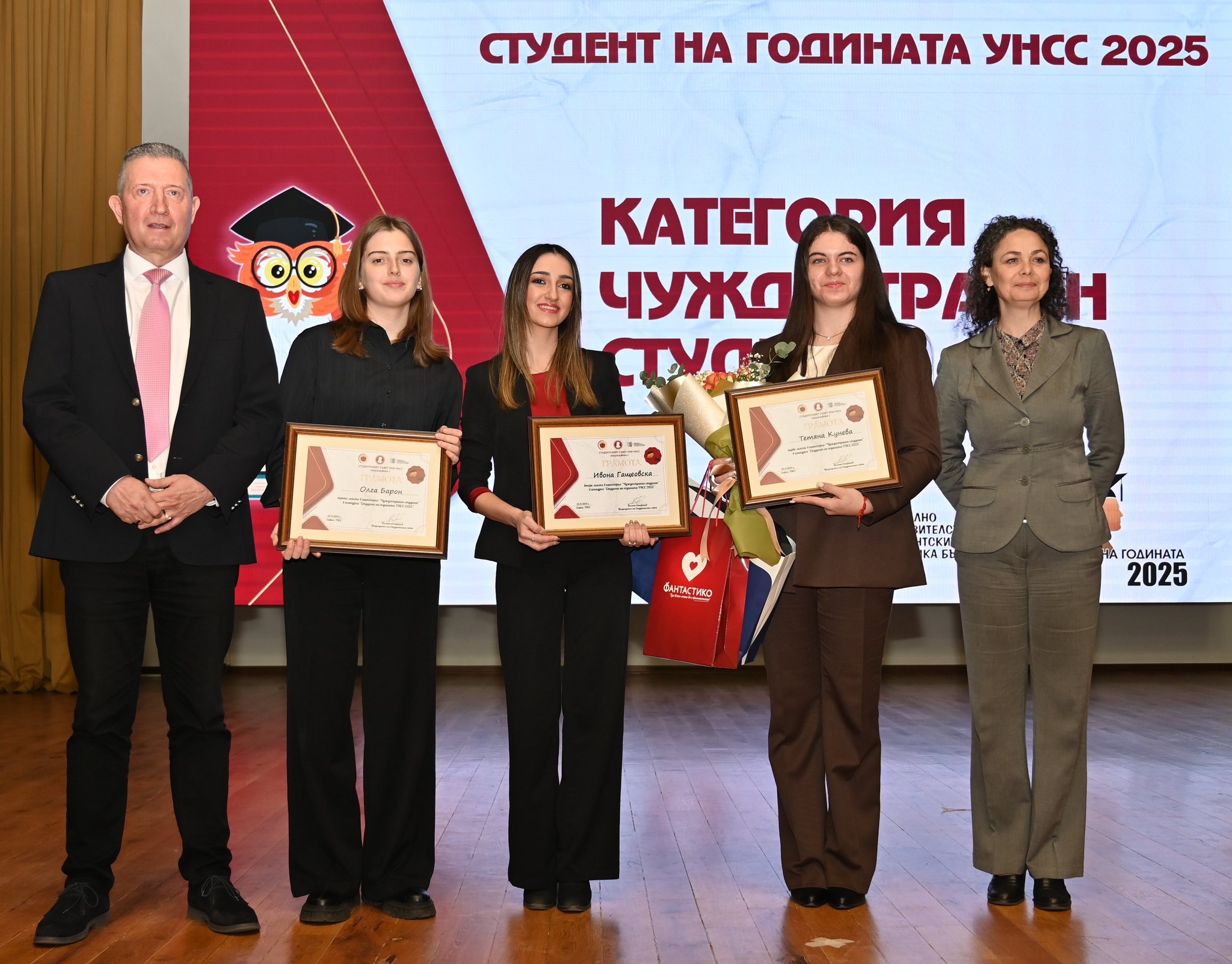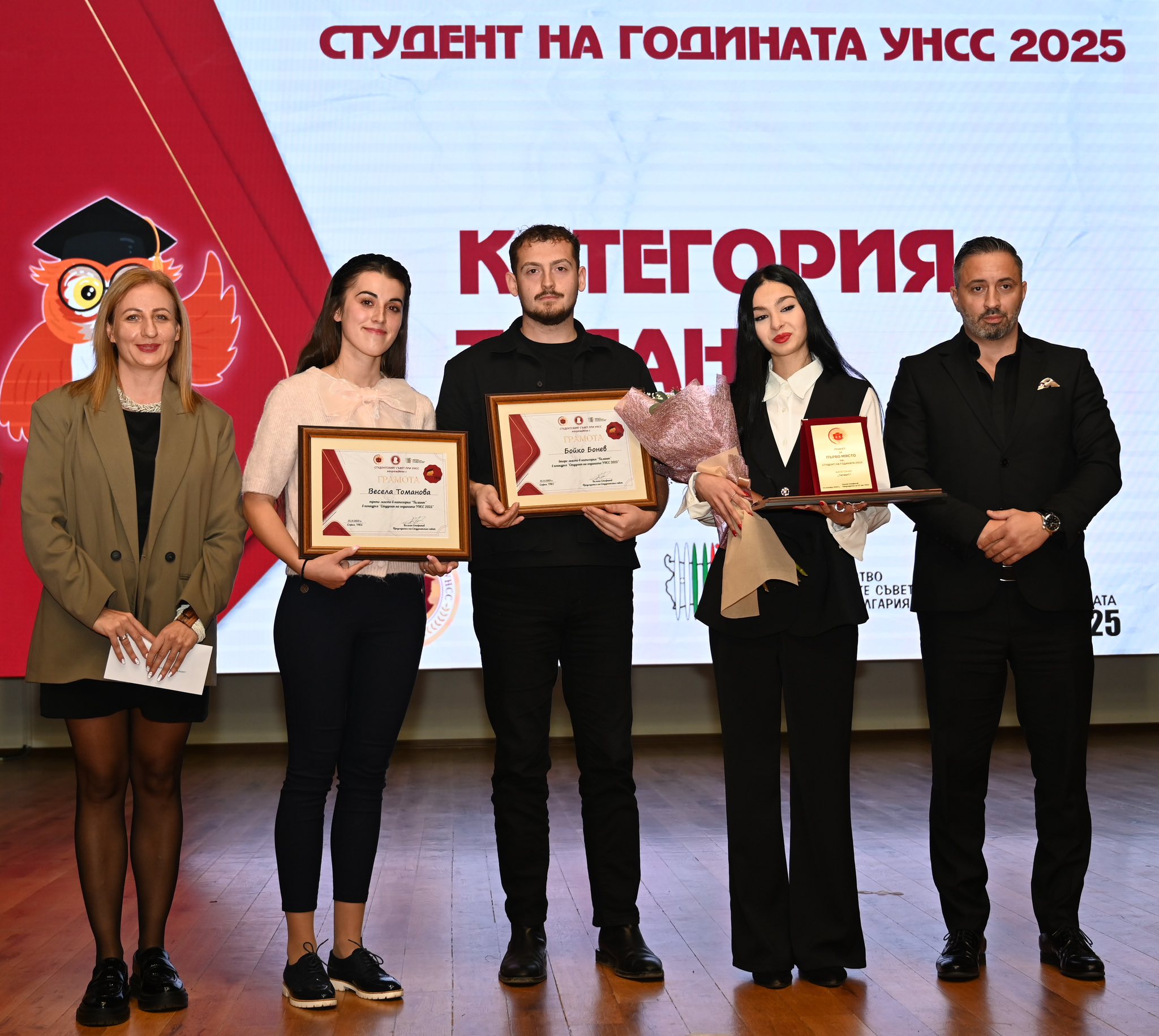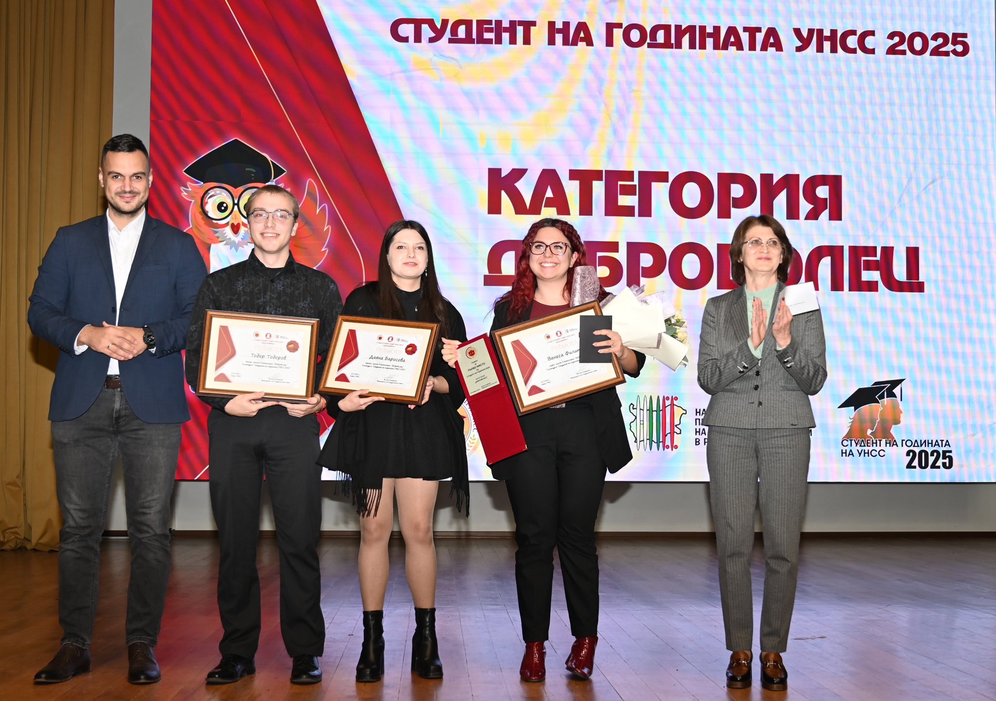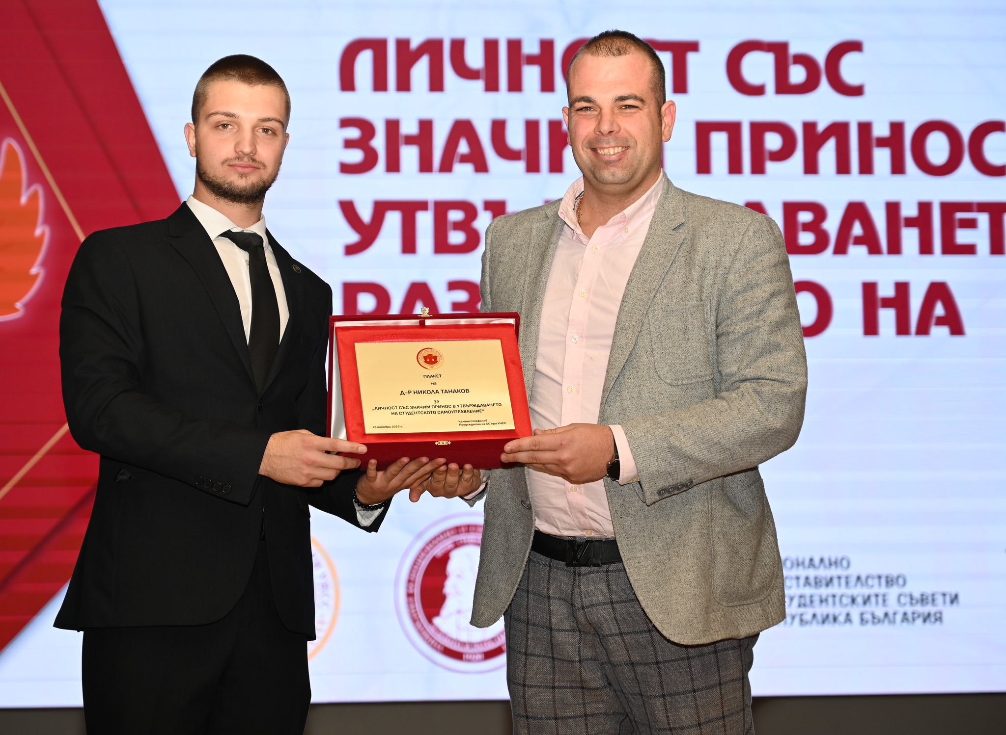 По традиция журито връчи и почетна награда „Личност със значим принос за утвърждаването и развитието на конкурса „Студент на годината“. С приза за 2025 г. бе отличен гл. ас. д-р Никола Танаков – директор на Националния студентски дом и преподавател в катедра „Регионално развитие“.