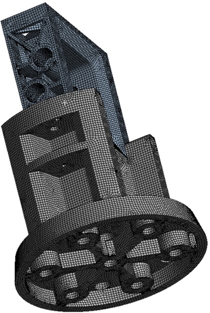 There is no need to simplify the fixture model geometry, as it is not overly complex and the 3D model is used as is for the analysis. Bolted connections to the armature are presented by imprints of bolts to the fixture and thus are not included in the model. Used for simulations geometry model is shown in Figure 3 b).
