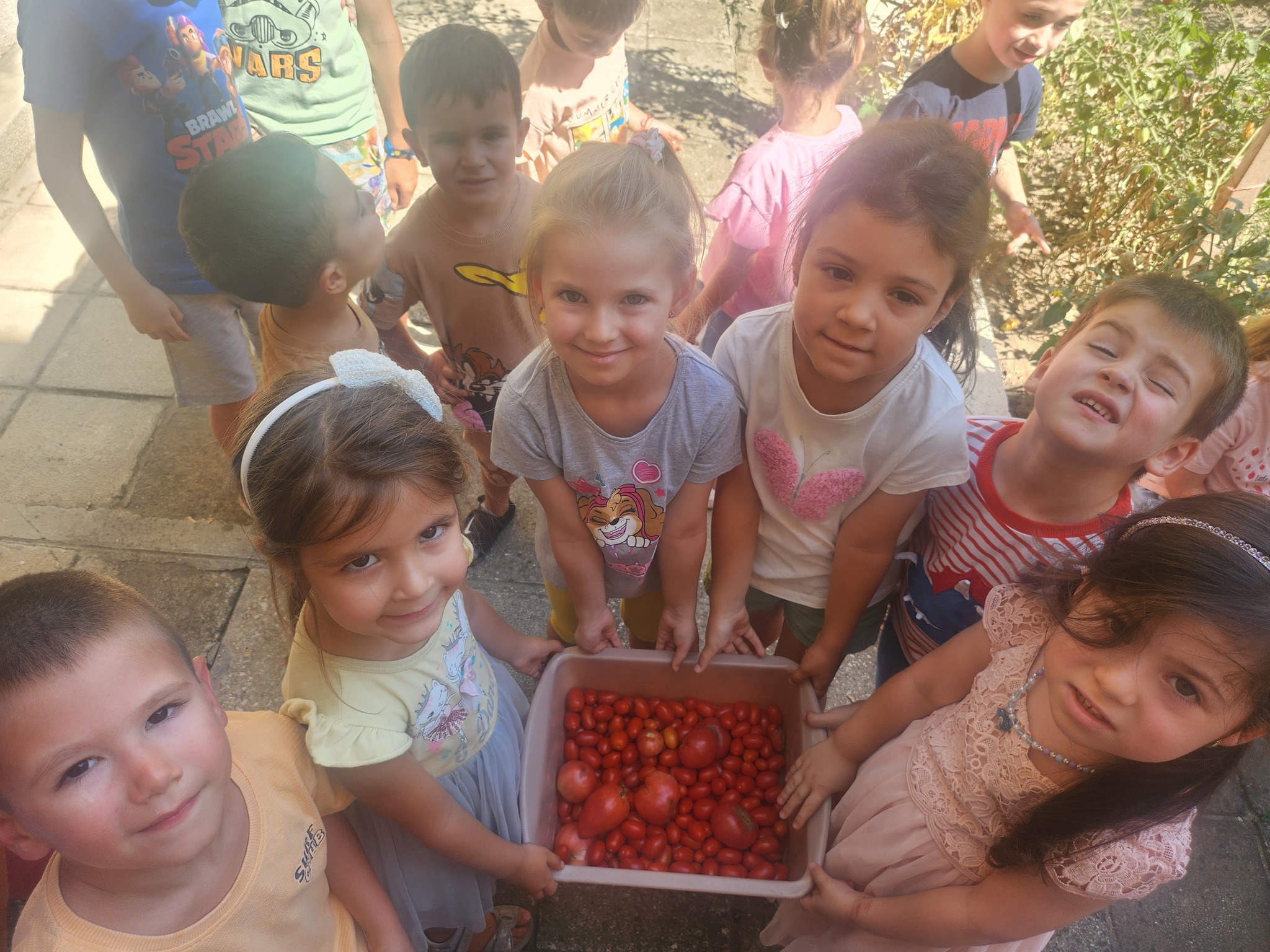 Децата в ДГ № 14 „Дружба“ във Варна разполагат със собствена биоградина. В нея те отглеждат подправки и зеленчуци, а днес се радват на домати собствено производство.
