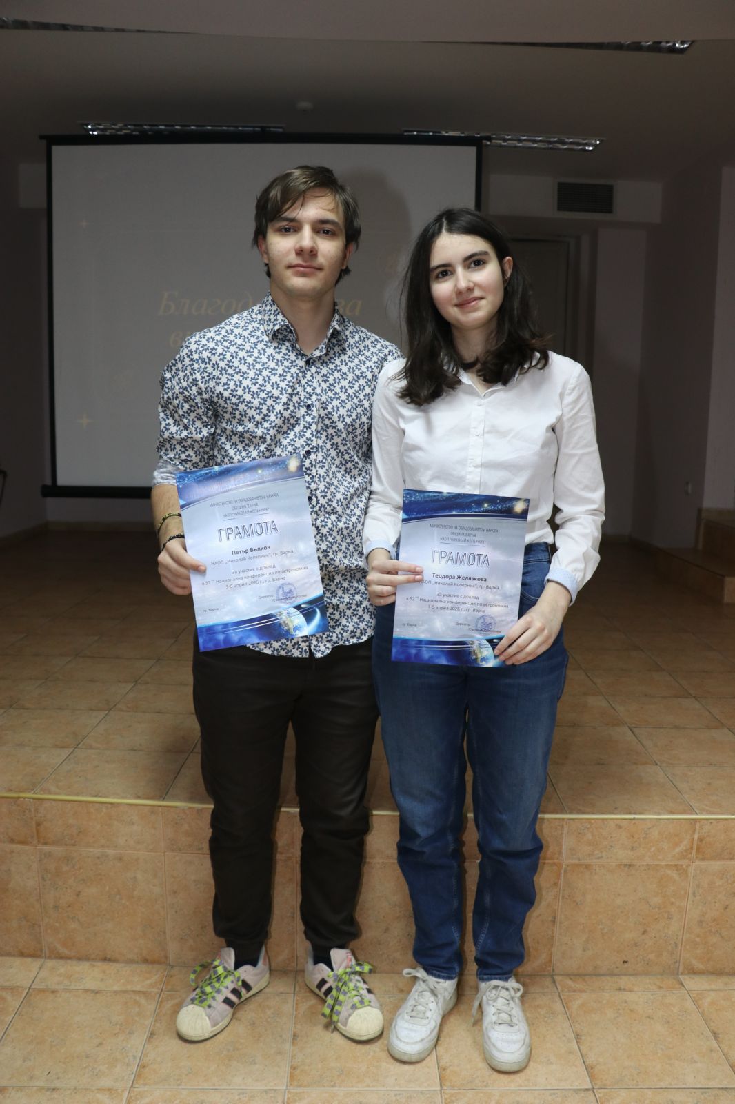 Учениците от НАО „Галилео Галилей“ – Силистра, Ясен Тодоров (СУ „Н. Вапцаров“) и Симеон Пиринков (ОУ „Иван Вазов“), изнасят атрактивен доклад на тема „Космически мечки“. „Те показаха научно изследване с улавяне на т.нар. космически мечки – живи организми, които са попаднали чрез космически обекти на Земята“, разказва събеседничката ми.