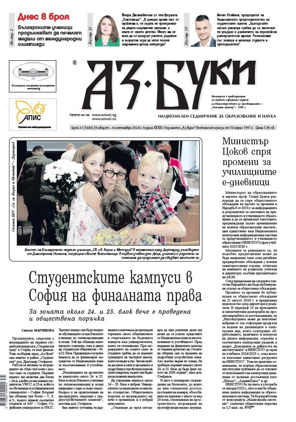 <h4><img class="size-medium wp-image-132911 alignleft" src="https://azbuki.bg/wp-content/uploads/2024/09/azbuki-35-24-210x300.jpg" alt="" width="210" height="300" />В новия брой на изданието:</h4> - Студентските кампуси в София на финалната права - Пет медала от Олимпиадата по астрофизика - Таекуондото влезе в спортните училища: През новата учебна година в тях ще се провежда обучение в 32 дисциплини - Над 70 000 ученици в занимания по интереси - По Националния календар през миналата учебна година са проведени 81 национални и 7 международни изяви - <strong>МАРШРУТИ „АЗ-БУКИ“</strong>- Първи редове в книгата на добрината: 14. ДГ „Дружба“ във Варна разполага със собствена солна стая, мобилен фитнес и биоградина за зеленчуци и билки - Да запазиш специалности, необходими за региона: Два центъра изграждат в ПГ по техника и технологии „Христо Ботeв“ – Смолян - Когато родители и педагози си подават ръка - Нова учебна база посреща учениците от ОУ „Св. Иван Рилски“ в Перник - Изкуството през техните очи: Две ученички от Центъра за подкрепа на личностното развитие в Ардино със самостоятелна изложба <a class="fp-embed" style="max-width: 100%;" href="https://73fc06f9.flowpaper.com/352024/" data-fp-width="400px" data-fp-height="300px">Вестник „Аз-буки“ – брой 35/2024 г.</a><script async defer src="https://cdn-online.flowpaper.com/zine/3.8.3/js/embed.min.js"></script> <a href="https://azbuki.bg/wp-content/uploads/2024/newspaper/%D0%B2.%20%D0%90%D0%B7-%D0%B1%D1%83%D0%BA%D0%B8%2C%20%D0%B1%D1%80.%2035%2C%202024%20%D0%B3..pdf" target="_blank" rel="noopener">Изтеглете</a> броя на вашeто устройство.